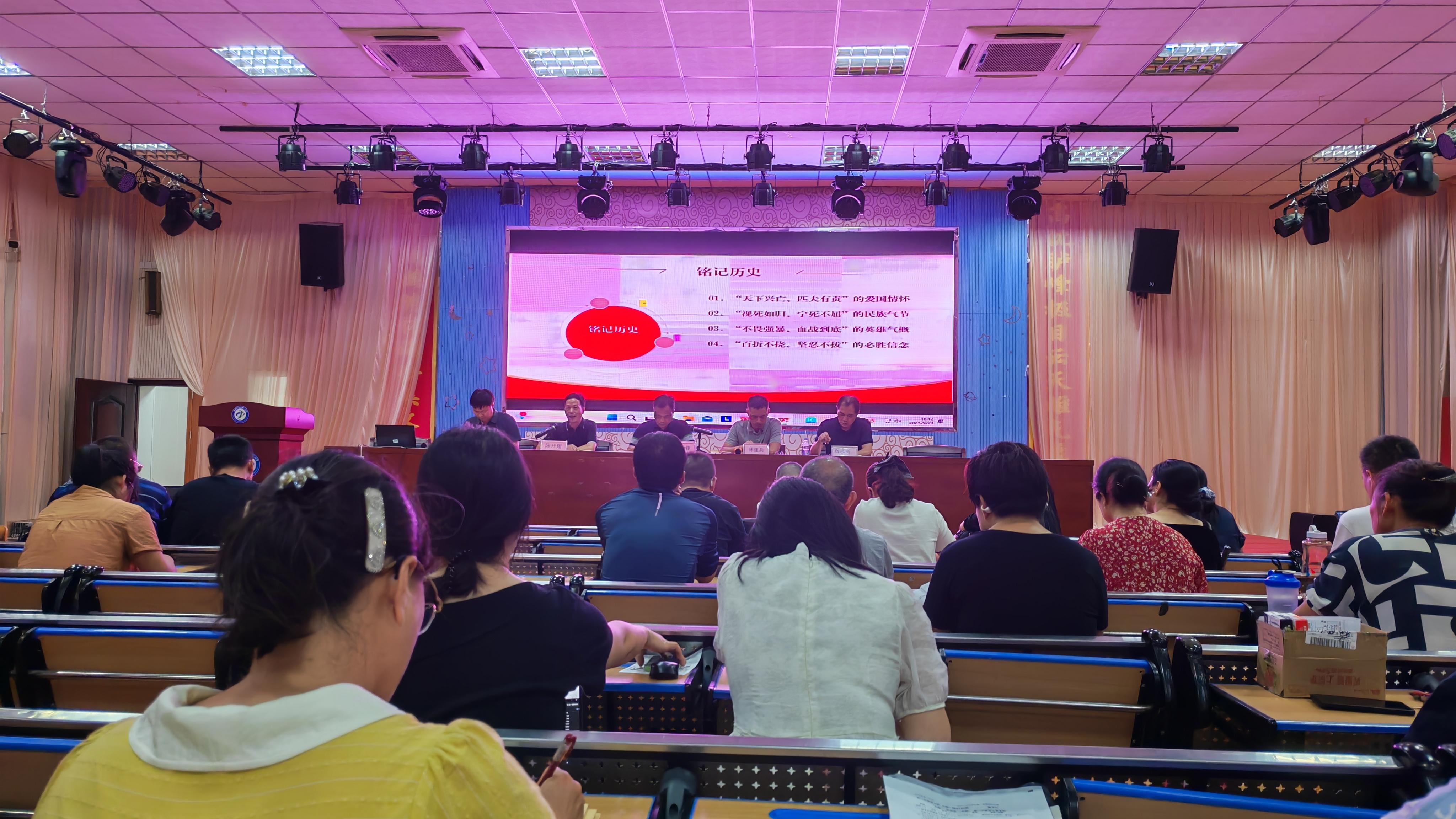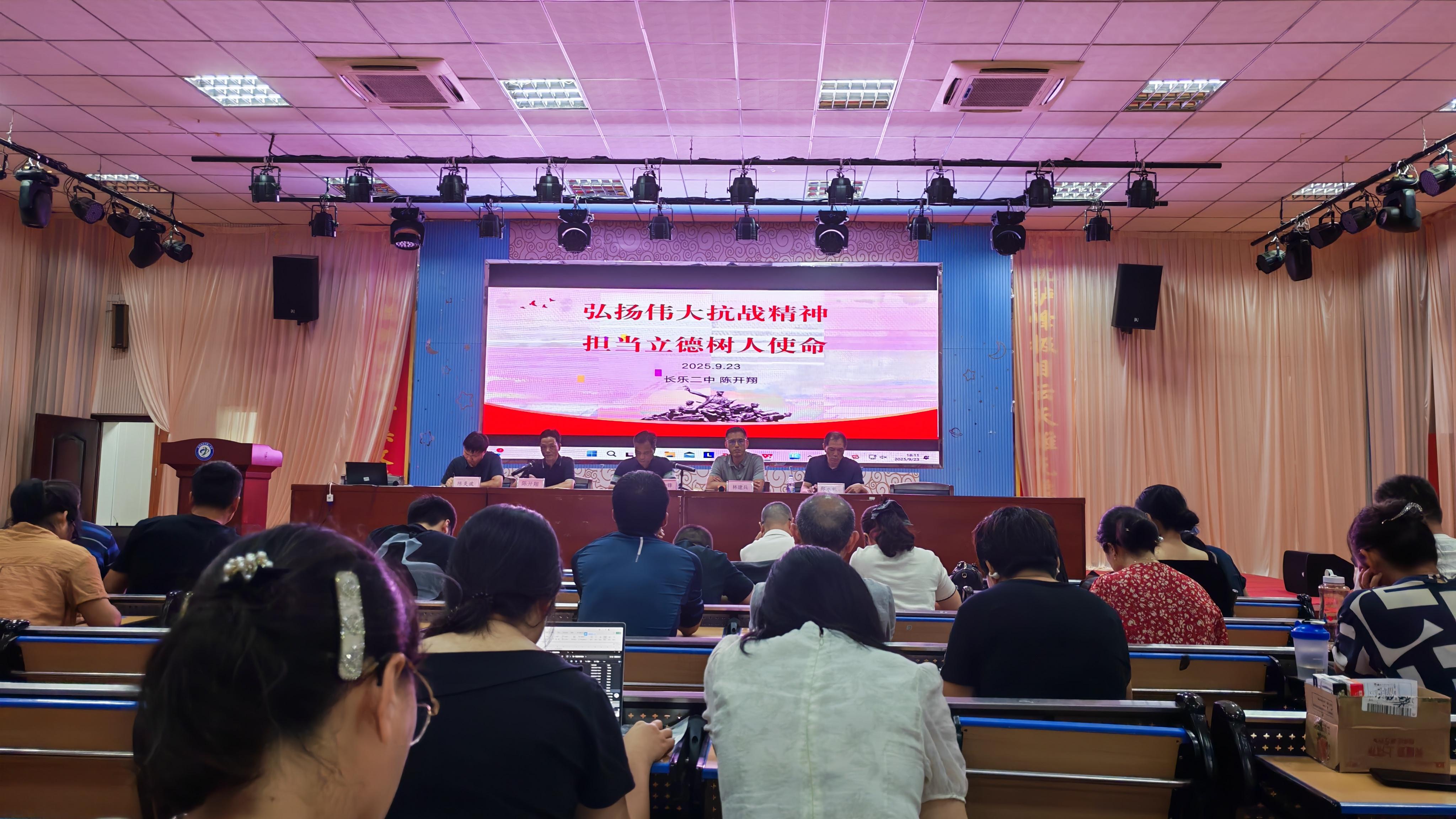 为深入学习贯彻习近平总书记关于抗战精神的重要指示,引导广大党员教师传承红色基因,担当育人使命,2025年9月23日,长乐二中组织开展了以“弘扬伟大抗战精神 担当立德树人使命”为主题的专题党课。本次党课由陈开翔副校长主讲,带领全体教职工重温抗战历史、感悟精神伟力,凝聚育人初心,激发使命担当。